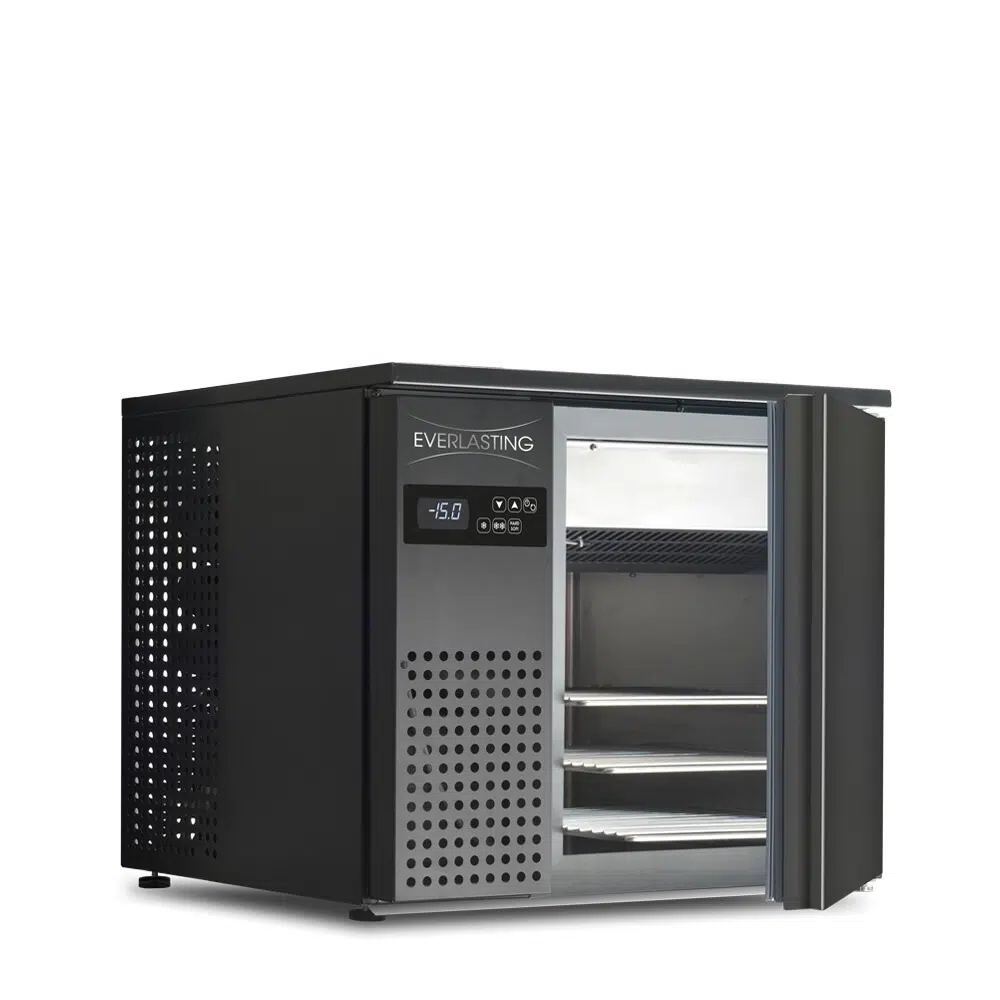 Kompaktne, elegantse disainiga ja puutetundliku juhtpaneeliga kiirjahutuskapp EVERLASTING BASIC TRAY MINI. Mahutab 3 x GN 2/3 Väljast musta plastkattega metallist, seest roostevabast terasest.