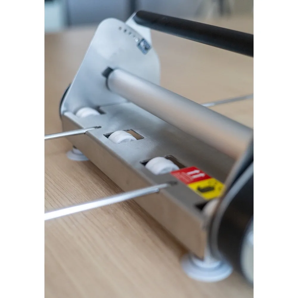 Vastupidav ja kompaktne roostevabast terasest rullimismasin sobib ideaalselt mitmesuguste taignatüüpide ühtlaseks rullimiseks. Nende hulka kuuluvad leivatainas, lehttainas, pitsataigen, aga ka fondant, martsipan, suhkrumass. Kuna rullimismasin on täielikult käsitsi juhitav ega vaja elektrit, saate seda kasutada kõikjal – nii köögis kui ka kohapeal.