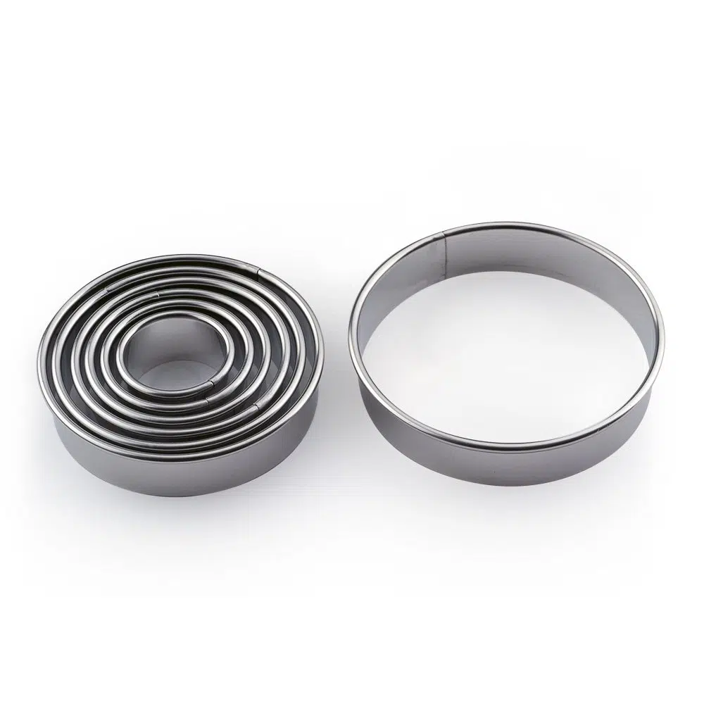 Komplektis 7 ümmargust lõikurit mõõtudega: 30x30mm, 40x400mm, 50x50mm, 60x60mm, 70x70mm, 80x80mm, 90x90mm.