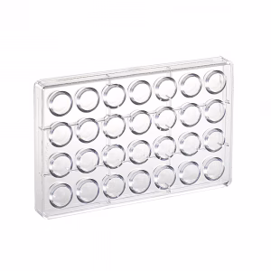 Polükarbonaadist šokolaadikommi vormi mõõdud 275×175 mm, süvendi mõõdud ø 26×23 mm, 28 süvendit, maht 11g