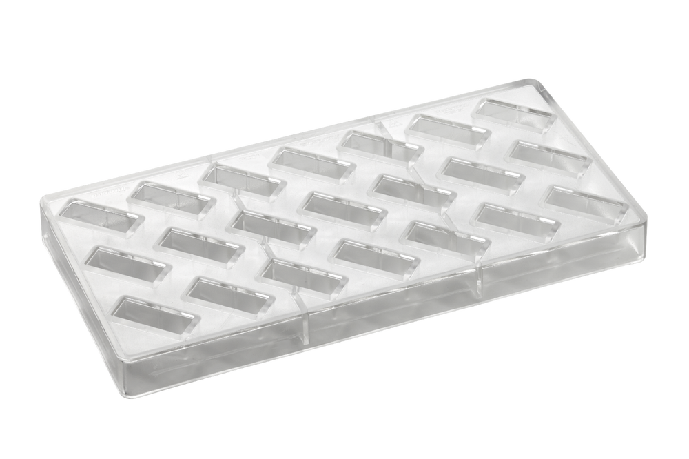 Innovaatiline šokolaadikommi vorm, originaalne ja geomeetrilise kujuga. Vormi mõõdud 275×135 mm, milles 21 süvendit mõõtudega 14x37x19 mm, ca 10 g.