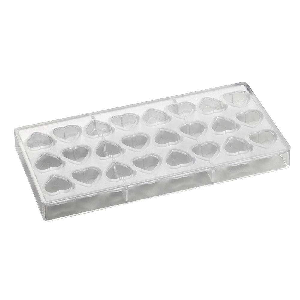 Traditsioonilised südamekujulised pralineevormid, mille mõõdud 275×135 mm, vormis 24 süvendit mõõtudega 25x28x16 mm, ca 7 gr.