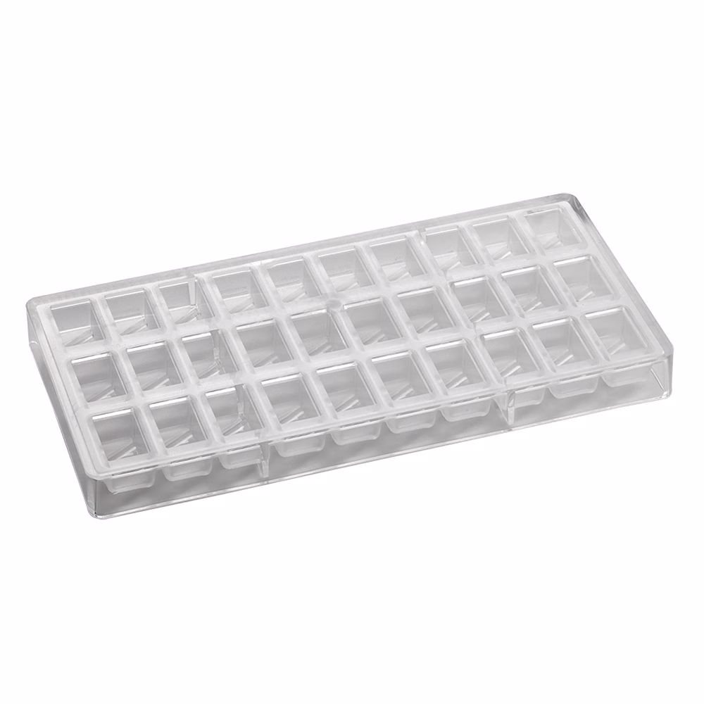 Traditsioonilised pralineevormid, mille mõõdud 275×135 mm, vormis 30 süvendit mõõtudega 32x19x16 mm, ca 10 gr.