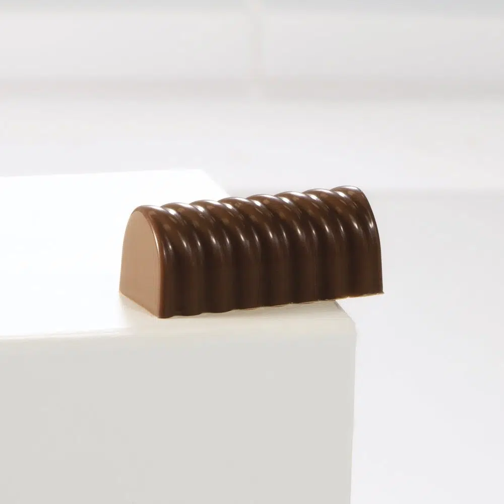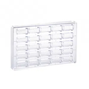 Polükarbonaadist šokolaadikommi vorm Twist mõõtudega 275×175 mm. Vormis 25 kommisüvendit, iga kommi mõõt 40x19x16 mm, ca 11g.
