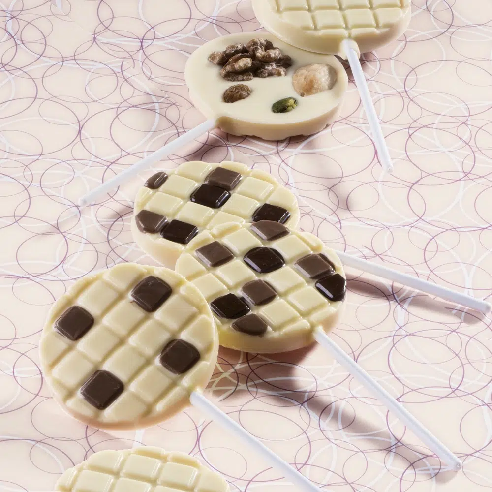 Termoplastikust ümmarguse šokolaaditahvli pulgakommi vorm.