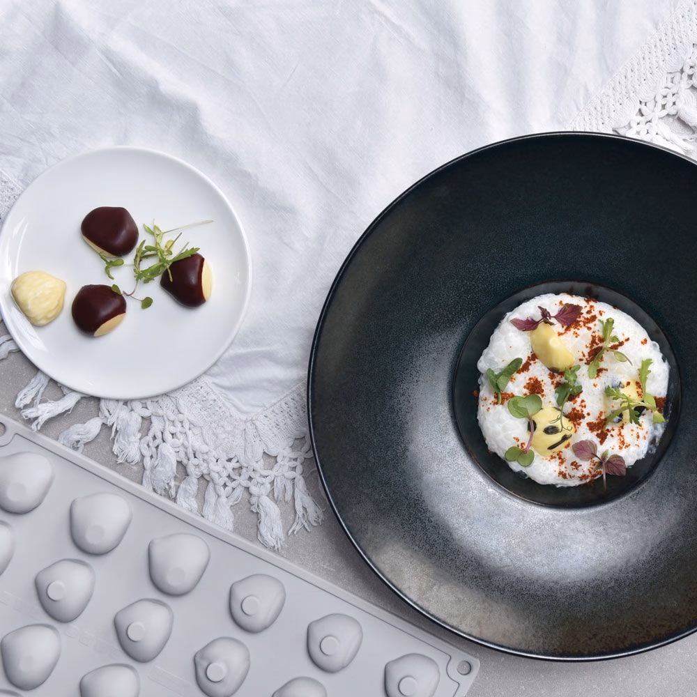 Detailsed ja silmapaistvad tekstuurid. Silikoonvorm, mida saab kasutada eelroogade, pearoogade ja dessertide valmistamiseks. Palju võimalusi, katsetage nii soojade kui külmade roogadega. Unikaalne võimalus kasutada oma loovust. Süvendi mõõdud 31x27x16 mm, ühes vormis 24 süvendit, ca 6ml