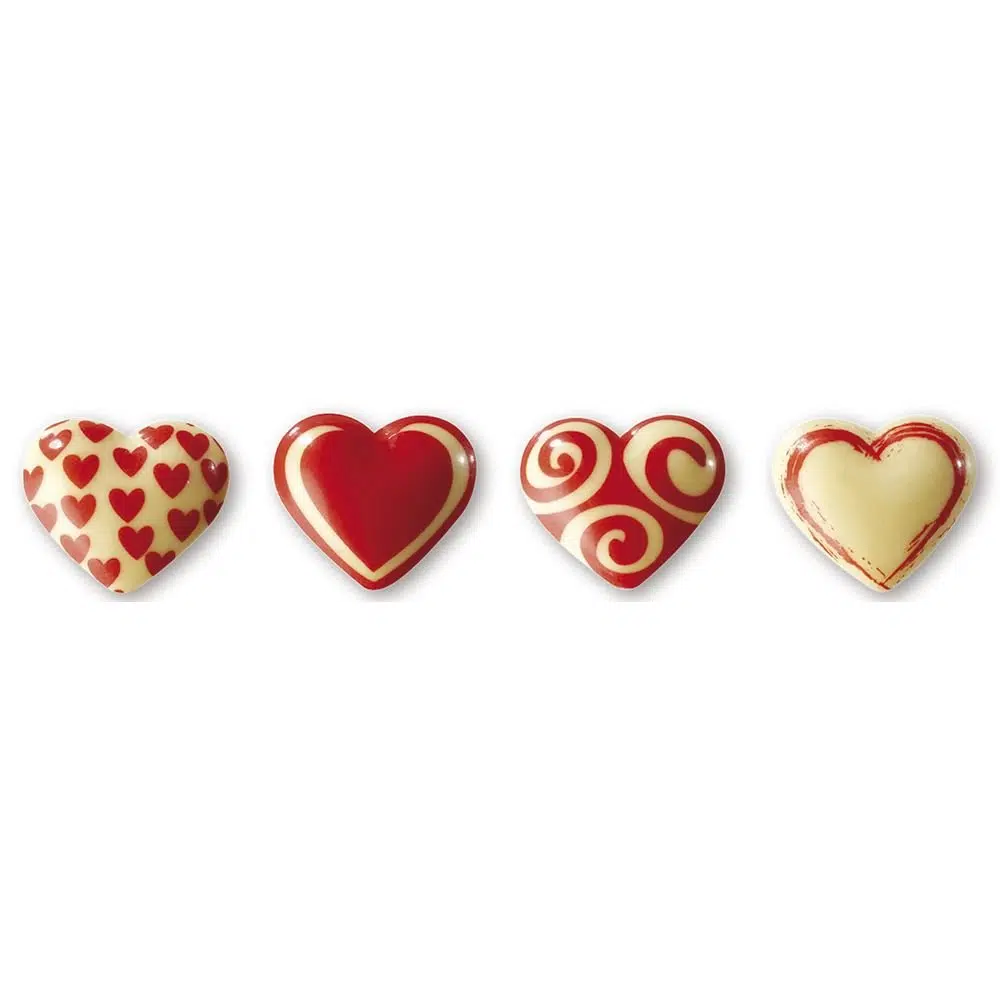 Pressitud termoplastikust šokolaadidekoori vormid südamete valmistamiseks. Valmis disain, sul jääb ainult vorm täita sobiva šokolaadiga. Komplektis 10 lehte ning 4 erineva disainiga südant, süvendeid 630 ning südame mõõt 33×29 mm